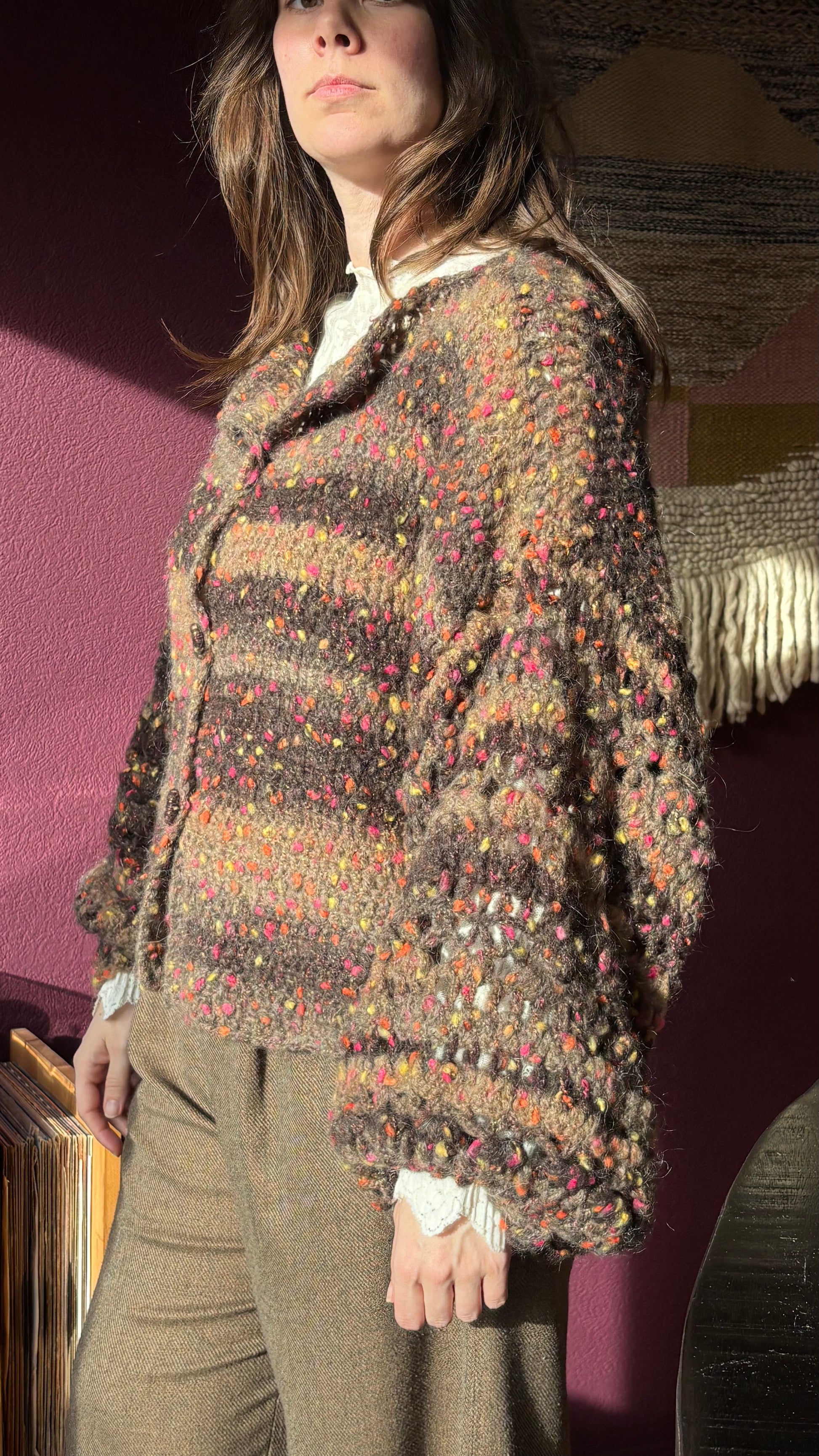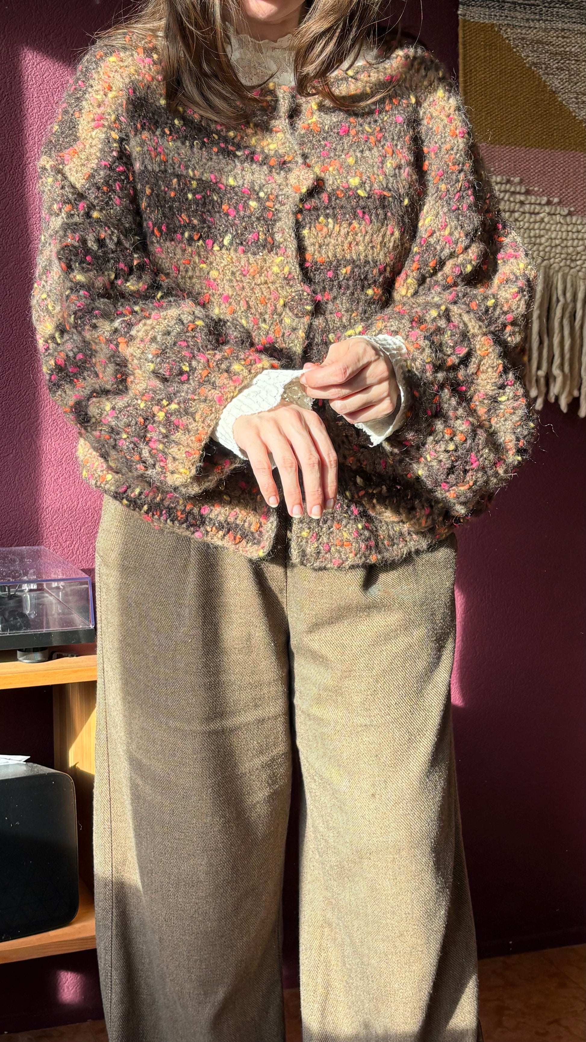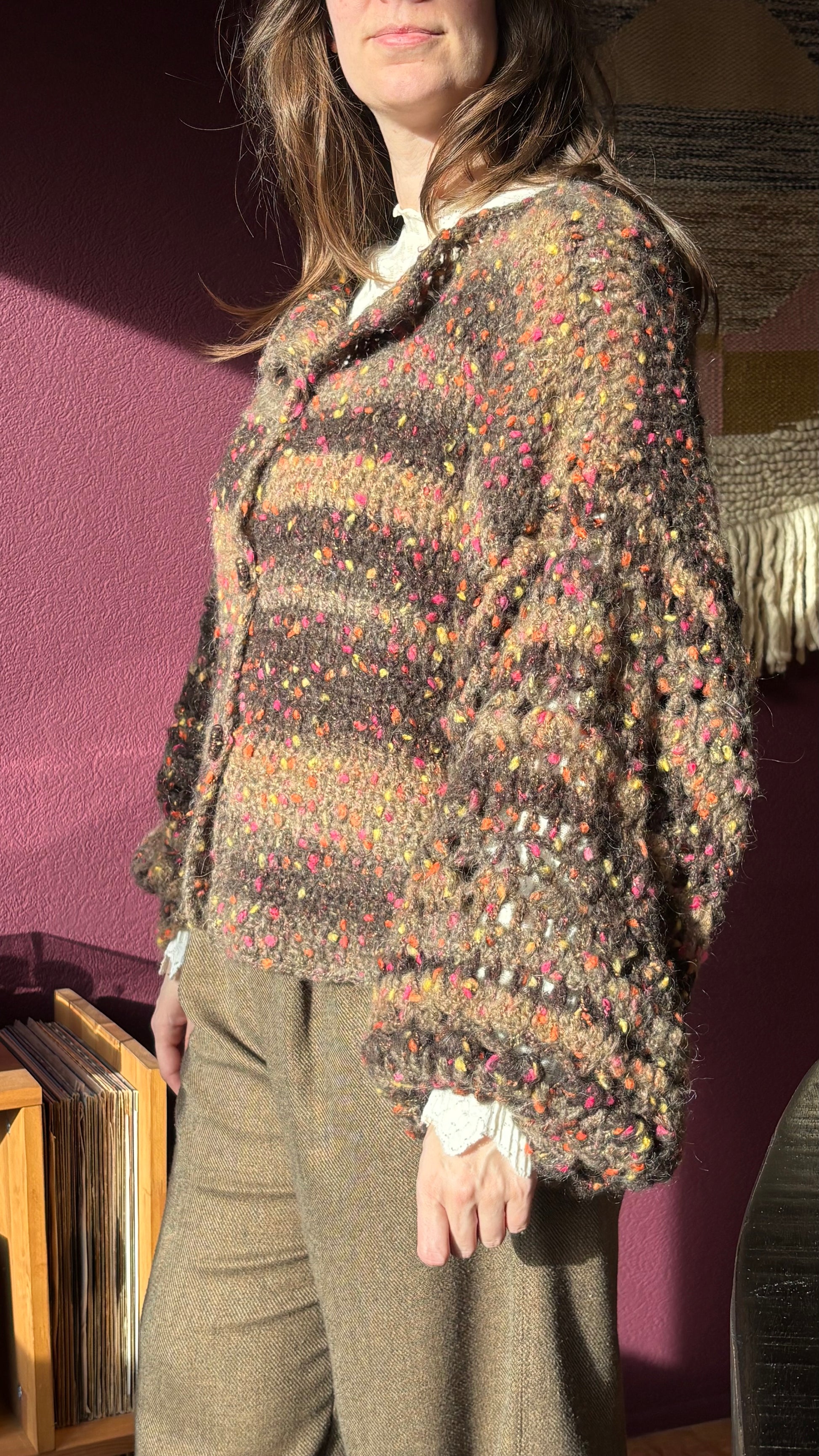 Heerlijk warm vest met kleurige stipjes. Lekker woonvest met ballonmouwen.